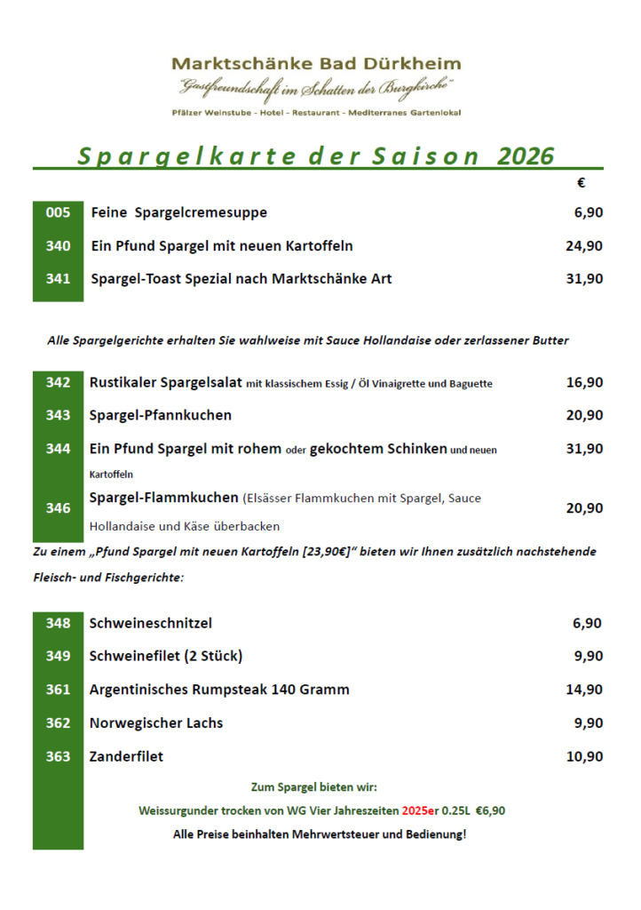 Bitte reservieren Sie unter Tel. 06322-95260 oder E-Mail: info@marktschaenke-badduerkheim.de einen Tisch.